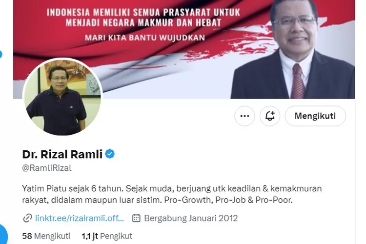 Akun x yang tertera nama lengkapnya: Dr Rizal Ramli diketahui ajtif sejak Januari 2012. Mengikuti 58 akun dan diikuti 1,1 juta warganet.